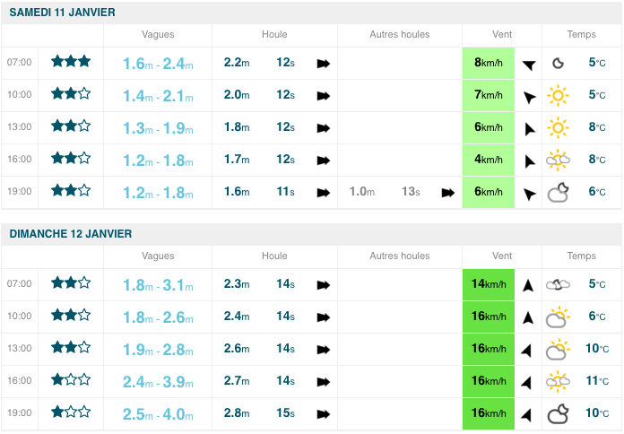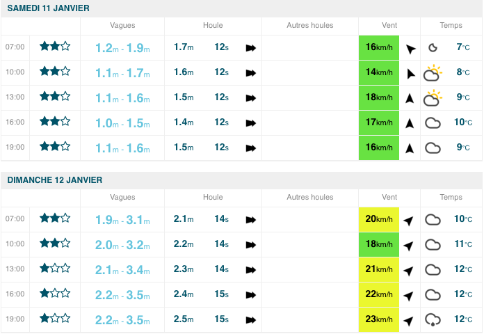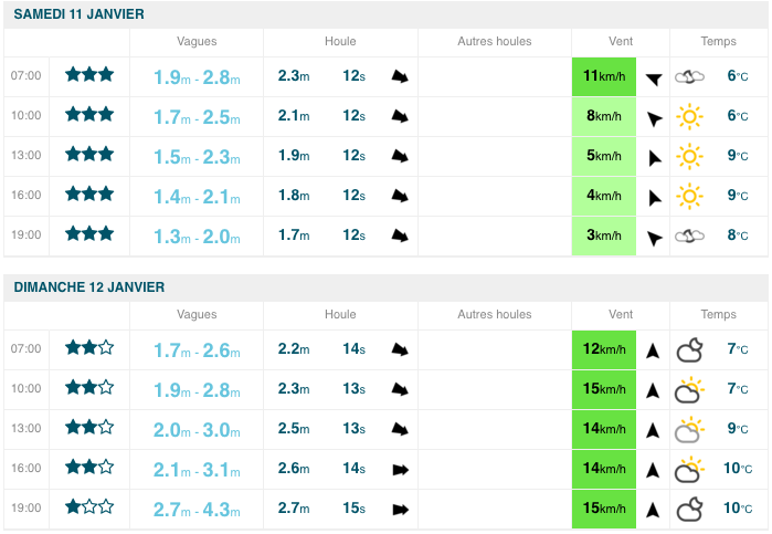 Des conditions légèrement différentes en Charente puisque tout au long de la matinée du samedi, le vent sera offshore ! La houle sera alors descendante, avec 2,2m, 12s de période, le matin, puis 1,6m, 11s de période, le soir. Le meilleur créneau sera au cours de la matinée.