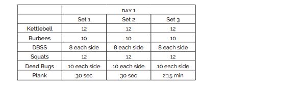 Semaine 2 - Jour 1: Kettlebell, Burbees, Dumbbell Bulgarian Split Squats,Squats, Dead Bugs, Plank