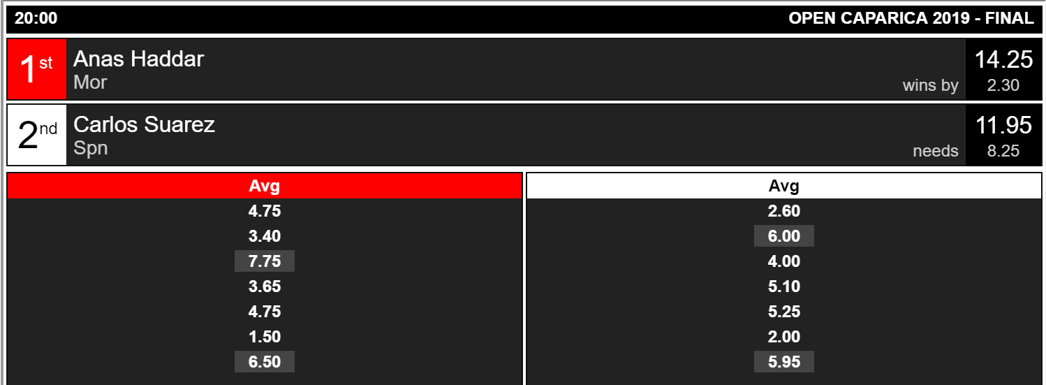 Ainsi le champion marocain arrive en finale face à l'espagnol Carlos Suarez qu'il finit par éliminer en scorant un total de 14.25 points, qui lui permet de décrocher la pôle position de la compétition.