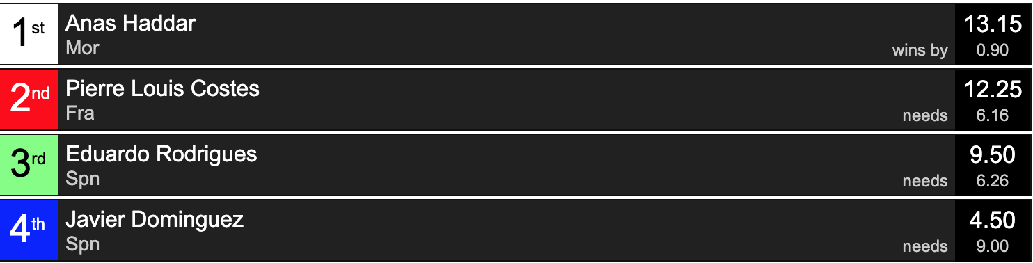 Après avoir dominé le deuxième round, Anas garde la même envie d'aller plus loin dans cette compétition et remporte le 3ème round devant le multiple champion du monde Pierre Louis Costes. Anas Haddar score deux vagues à 7.50 & 5.65 points pour un total de 13.15 points.