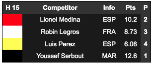 Quant au champion du sud du Maroc, Ayoub Adardour qui domine dès le début de la compétition avec deux victoires lors de ses deux premiers tours avec respectivement les scores de 12.1 points et 10.07 points et passe en deuxième position lors du 3ème tour avec le score de 11.57 points. Ayoub va vivre une série historique lors du 4ème tour contre deux champions du monde, Amaury Laverhne et Iain Campbell.