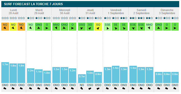 mardi matin (1m20, 8s). Le reste de la semaine, le vent est majoritairement onshore et avoisine les 15 km/h. Hormis jeudi où la période sera trop faible, il pourra être possible de se mettre à l'eau de nombreuses fois, malgré un plan d'eau légèrement dégradé.