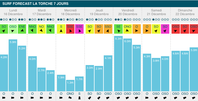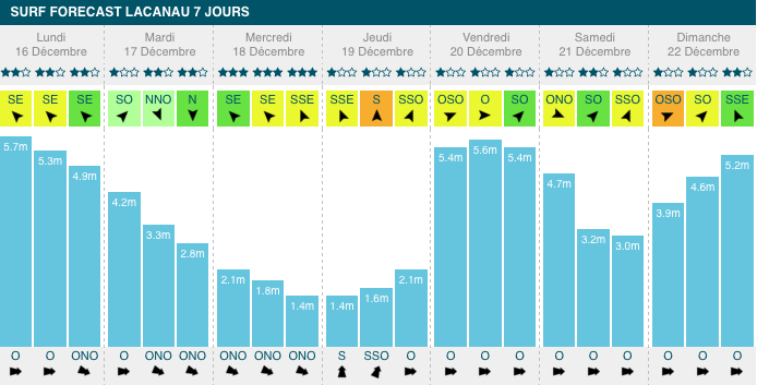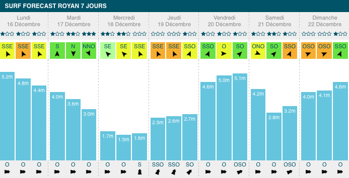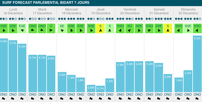 1,3m, 12s de période, avec un vent défavorable mais faible. À partir de mercredi, cette houle prendra de la taille, jusqu'à atteindre un pic à 3,3m, 16s de période, vendredi soir.