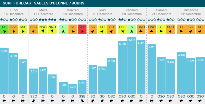 Cas de figure relativement différente du côté des spots vendéens. En début de semaine, il faudra s'attendre à une houle descendante qui passera de 2,4m, 17s de période, ce lundi, à 1m, 13s de période, mercredi. Beaucoup de changements à noter du côté du vent, qui change constamment de direction. À partir de jeudi, la houle gagnera en consistante, avec un pic à 3m, 17s de période, ce vendredi. Mais cette journée sera également marquée par un fort vent onshore compris entre 26km/h et 38km/h.