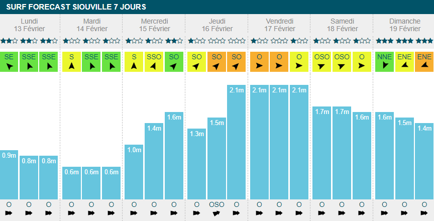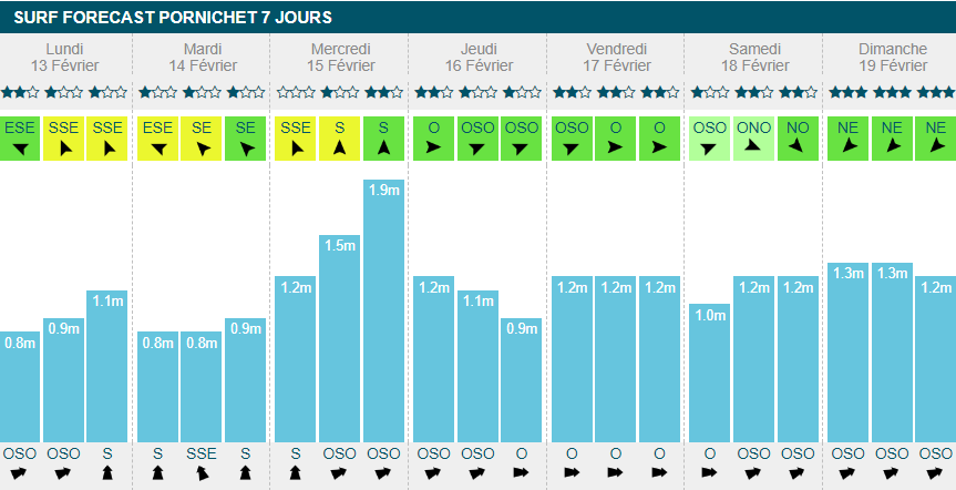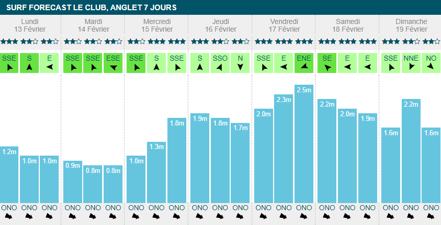 Ça commence doucement lundi, avec un petit 1m20 à la série, 13s de période et un vent offshore qui ne dépassera pas les 14km/h.