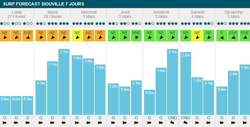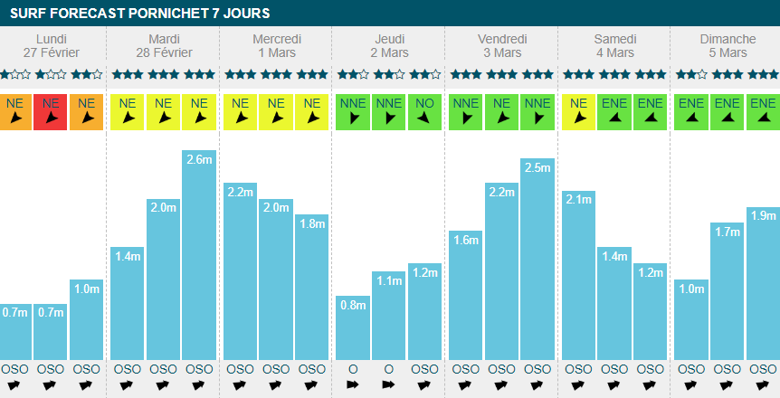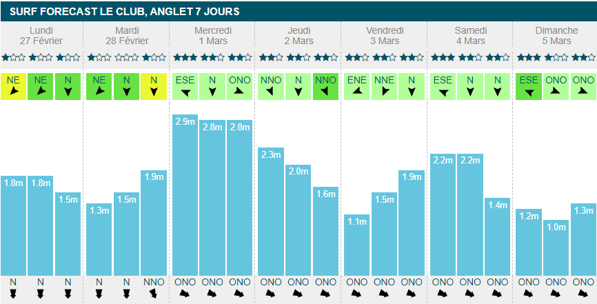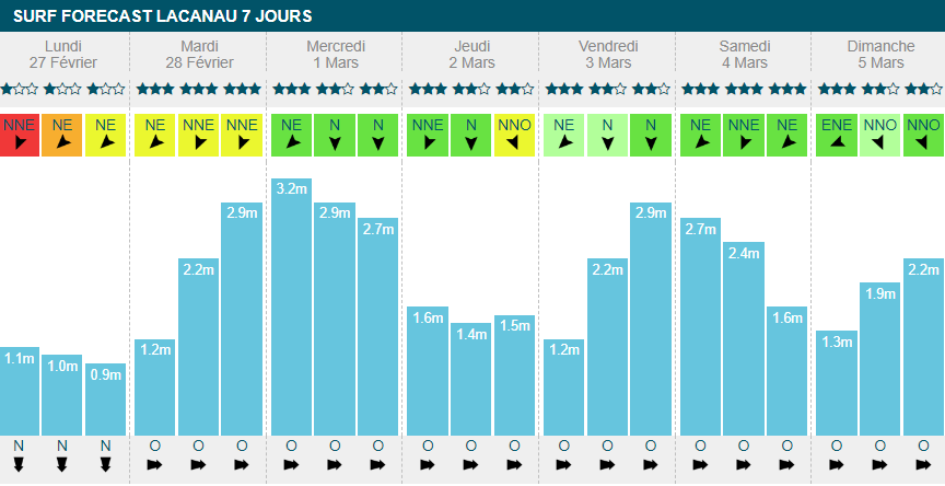 Beaucoup de vent prévu en début de semaine, qui soufflera vers le large pour creuser les vagues. Les grosses sessions du week-end sembleraient se détacher du reste de la semaine et proposeront des séries jusqu'à 2m50 vendredi. Le tout accompagné d'une période de 14s environ.