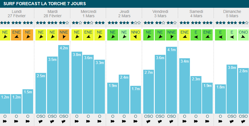 Du fait de son insertion lointaine dans l'océan Atlantique, la Bretagne observera les plus grosses conditions de la semaine en termes de vague. Elles culmineront une première fois à plus de 4m20 le mardi, puis repasseront la barre des 4m le vendredi.