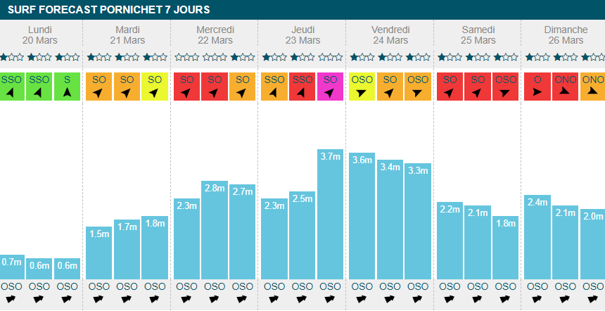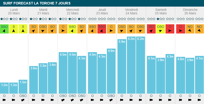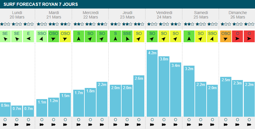 Mardi, mercredi et jeudi verront probablement de belles vagues déferler sur la côte. On attendra entre 1m50 et 2m60 sur ces journées alors que le vent ne dépassera pas les 22 km/h, bien en deçà de la moyenne nationale. En fin de semaine, les spots changeront de visage avec l'arrivée des grosses houles et des rafales de vent à plus de 45 km/h.