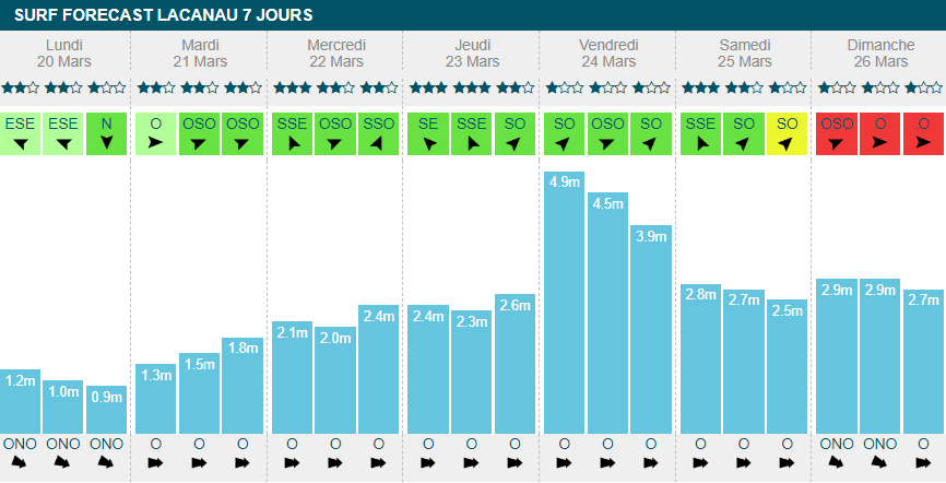 jeudi, on attendra entre 1m30 et 2m50 sur les spots landais. Le vent se fera doux, bien plus que dans le reste du pays. Il passera offshore de temps en temps, il faudra donc rester vigilant pour ne pas rater les sessions creuses et glassy. À partir de vendredi, l'entrée massive de houle sèmera le trouble, avec plus de 5m50 à la série.