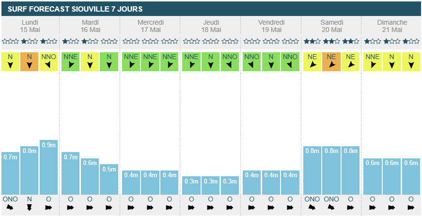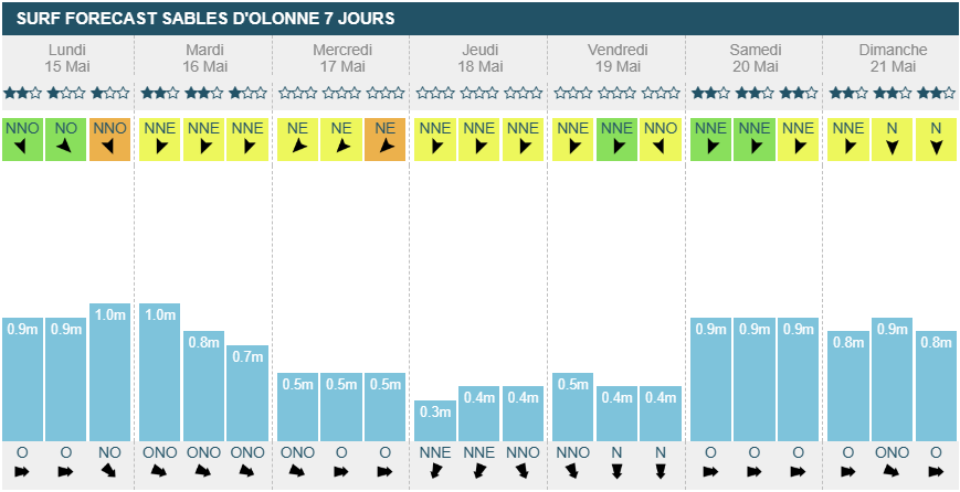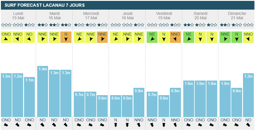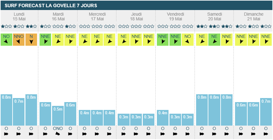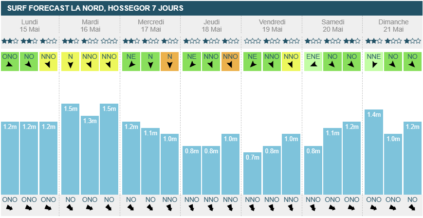 Mercredi matin il passera légèrement side-off et restera ainsi jusqu'à dimanche soir. La houle baisse légèrement mercredi entre 80cm et 1m, restant ainsi jusqu'à dimanche midi. Il y aura suffisamment de vagues pour surfer mais attention, l'orientation de la houle est annoncée comme Ouest/Nord-Ouest et même plein Nord jeudi soir et vendredi.