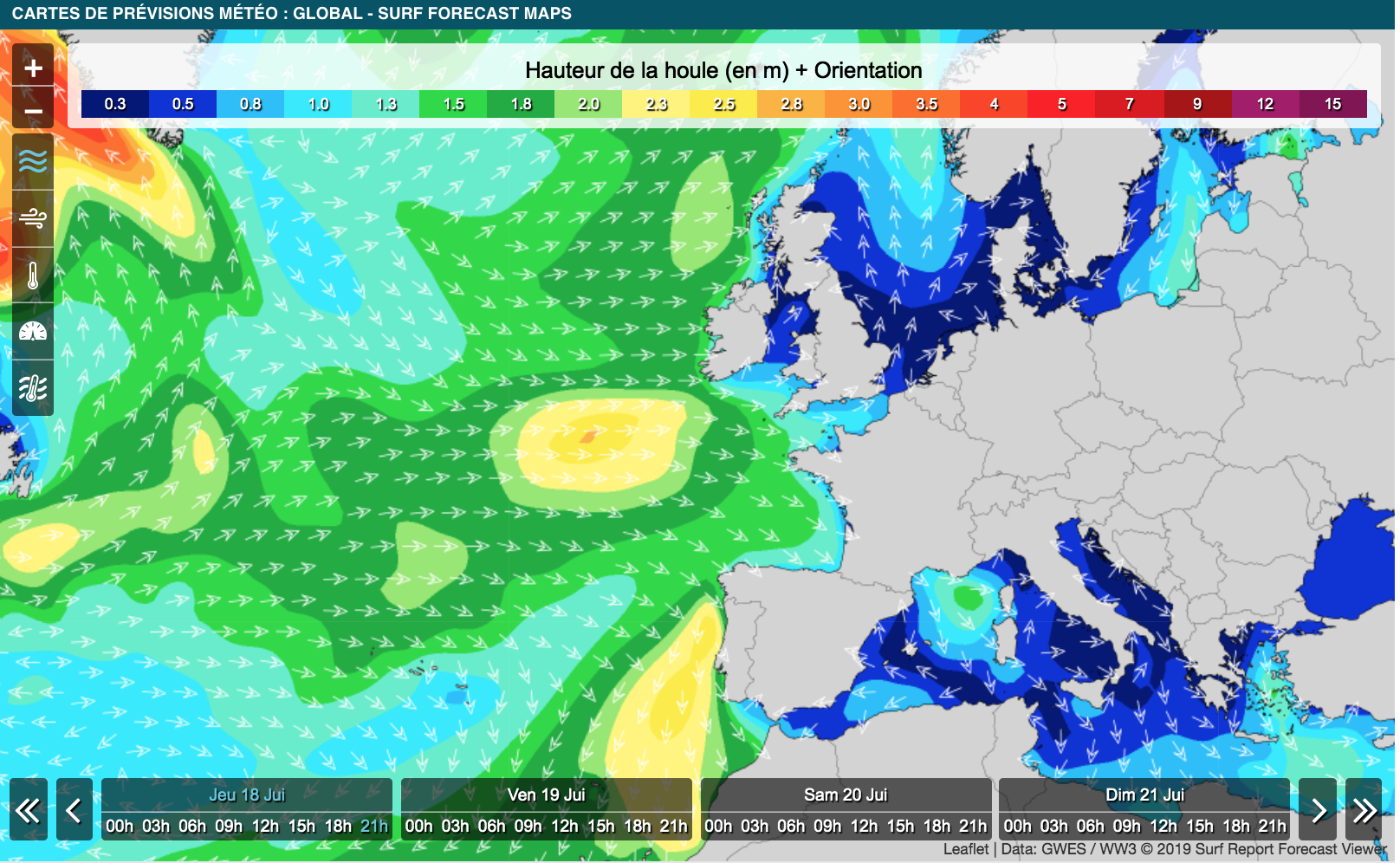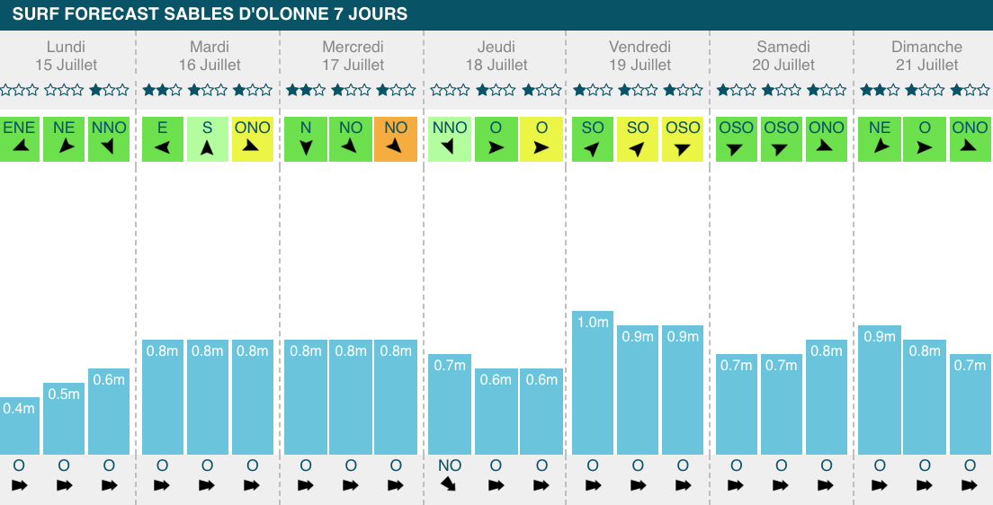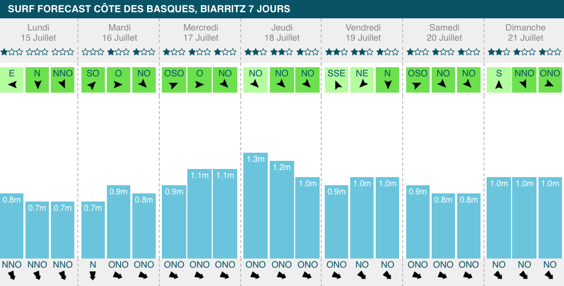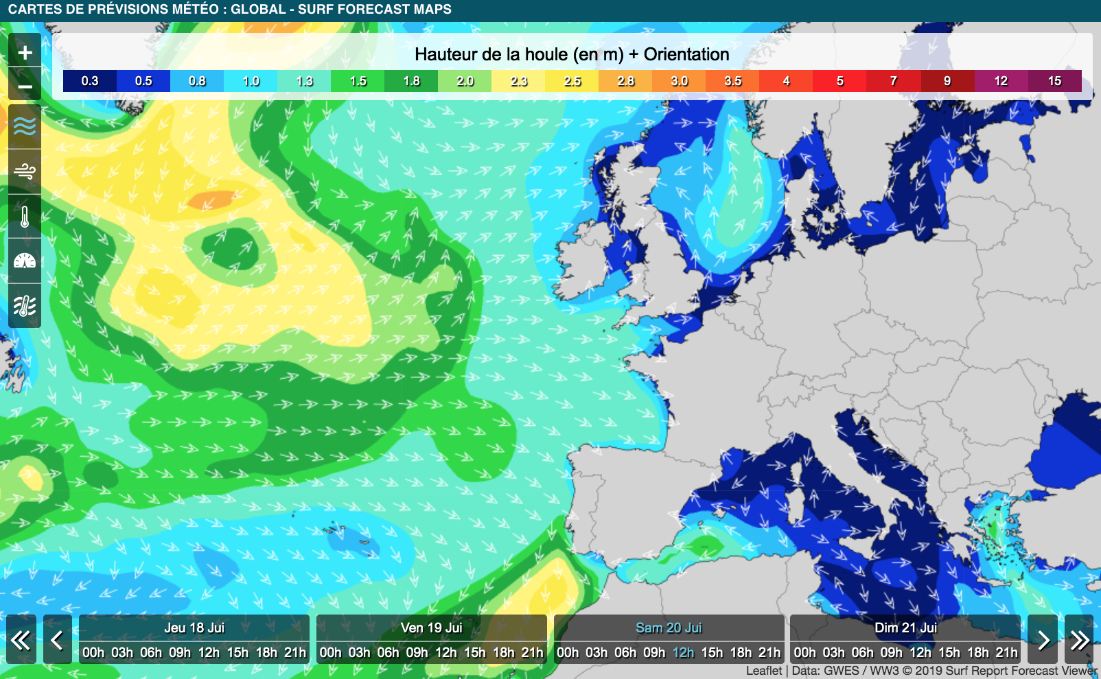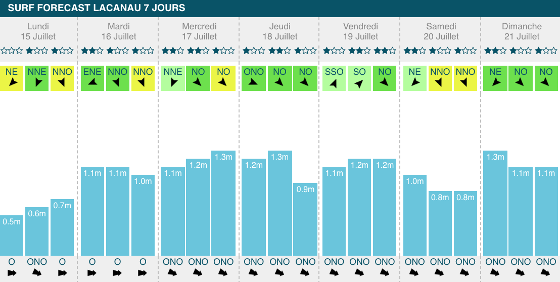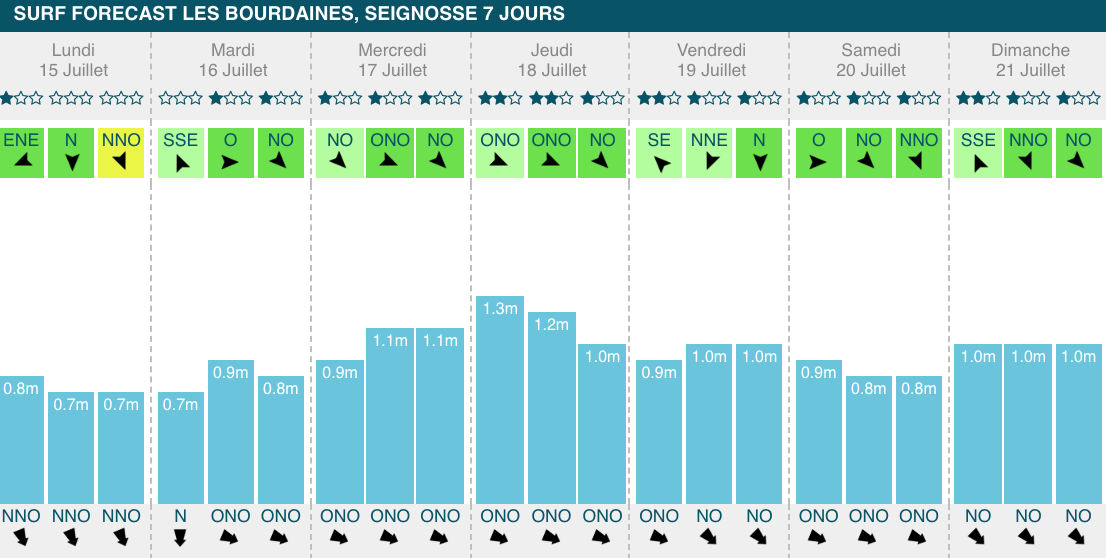 Avec une période qui varie entre 9s et 12s toute la semaine, et un vent n'excédant pas normalement les 15km/h il y aura peut-être de quoi se mettre sous la dent ! Les affamés vont pouvoir retourner glisser sur du petit, en attendant jeudi pour voir (peut-être) enfin, un mètre au pic...