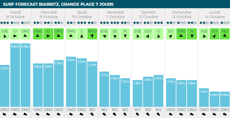 régulier, avec deux pics de houle : 2,4m mardi et jeudi, période 12s/13s. Le vent sera quant à lui quasi-nul et à tendance offshore en fin de semaine, et on pourrait avoir de jolies sessions de part et d'autres du Pays basque avec un swell constant estimé à 1,5m, période 10s à 12s, à partir de vendredi, générant des vagues jusqu'à 2m sur certains spots.