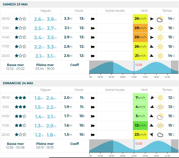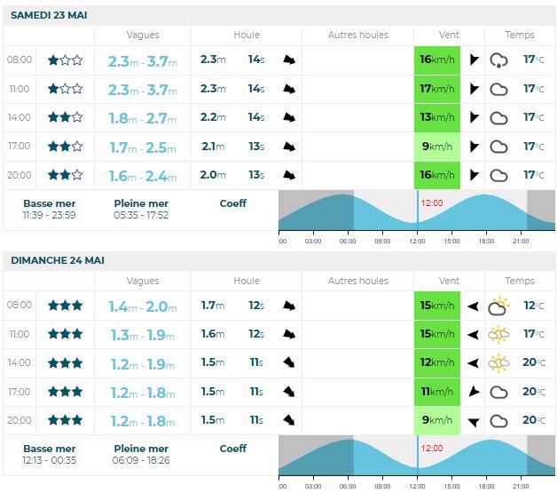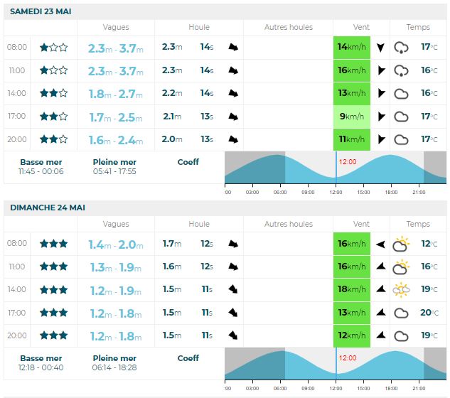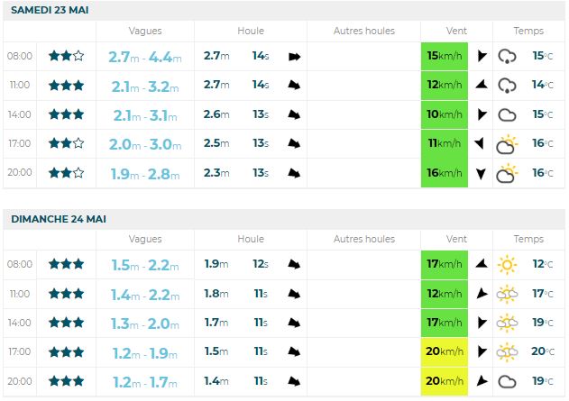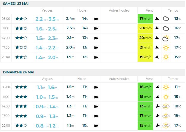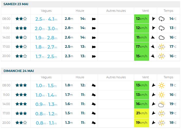 Des conditions différentes dans les Landes, mais pas moins prometteuse. Avec de la pluie samedi matin, c'est dans l'après-midi, avec la marée qui remonte, que cela devrait s'améliorer. On prévoit alors une houle à 2,2m et 14s de période, avec un vent de secteur nord à 14km/h. Dimanche matin en revanche, les conditions devrait être idéales avec une houle de 1,7m, 12s de période et un vent qui soufflera offshore à 14km/h.