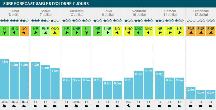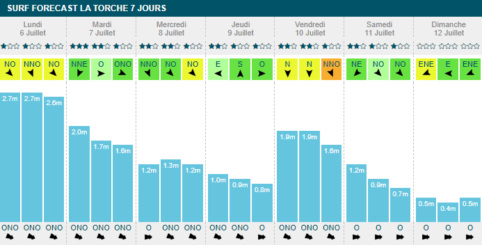 prévue aux alentours de 1m, 12s de période et un vent nord-ouest à 16km/h.