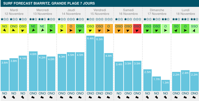 2,4m et 3,4m, période 14s, accompagné de vents (20km/h à 34km/h) de secteur est, cette journée s'avance comme la plus préférable.