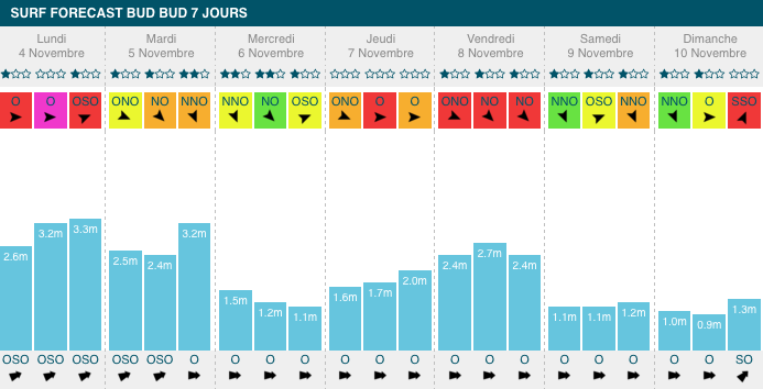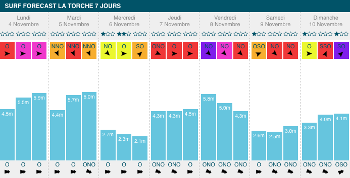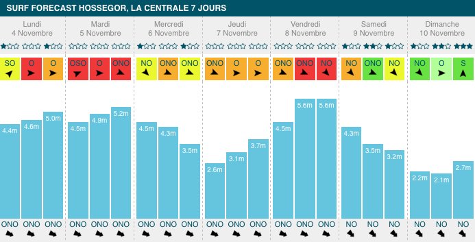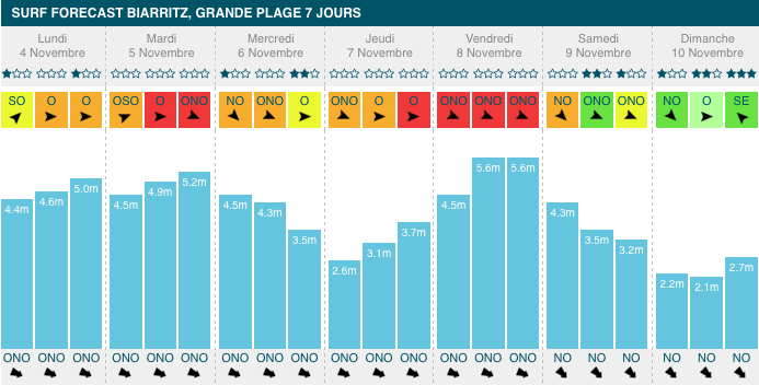 Et le pays basque connaîtra également un cas de figure équivalent, mais la configuration de ses côtes pourraient rendre les conditions plus favorables contrairement à ses département voisins. En effet, on prévoit un swell de 3,7m à 4,7m, période 12s/13s entre lundi et mardi, avant de voir la houle tomber sous les 3m dans la nuit de mercredi à jeudi, et reprendre de la consistance jusqu'à atteindre 5,2m, 12s vendredi. Le vent sera à prendre en considération jusqu'à ce jour, puisque des rafales d'ouest oscilleront entre 30km/h et 50km/h. Il faudra donc attendre le week-end pour voir un semblant d'accalmie, notamment dimanche : 2m de houle, 10s de période et un léger vent de secteur ouest.