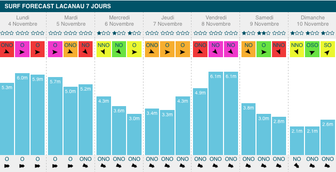 La partie gironde sera davantage exposée à la houle et au vent. En début de semaine, les prévisions indiquent une houle régulière qui oscillera autour des 5m, 12s/13s de période. Ensuite, le swell passera sous la barre des 3m mercredi, avec 13s de période et un vent de nord-nord-ouest compris entre 15km/h et 25km/h. Même cas de figure pour la fin de semaine : houle ascendante de 3,3m à 5,7m, 10s à 12s de période et un fort vent de secteur ouest jusqu'à samedi, puis des conditions plus clémentes samedi et dimanche.