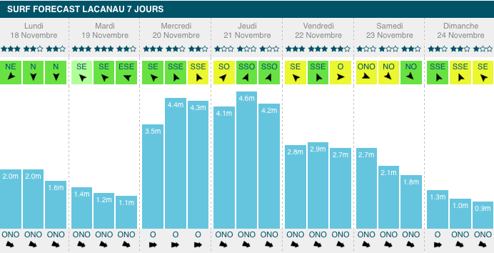 Début de semaine très intéressant du côté des côtes landaises avec un joli swell et des vents favorables. Tout au long de la journée de mardi, on attend une houle entre 1m et 1,4m, 12s de période et vent offshore. Ensuite, la consistance du swell devrait s'avérer trop importante pour la plupart des bancs de sable des Landes, avec un pic à 3,2m, 18s de période mercredi soir. Le créneau suivant (et solide), ce sera donc vendredi matin, avec