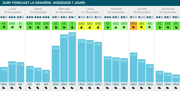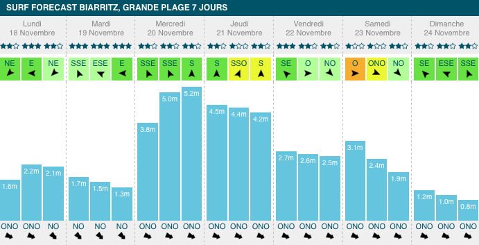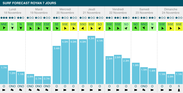 3,3m, 19s de période et vent de sud entre 13km/h et 18km/h. Puis la houle baissera au fil des jours jusqu'à tomber à 0,8m, 9s de période, dimanche