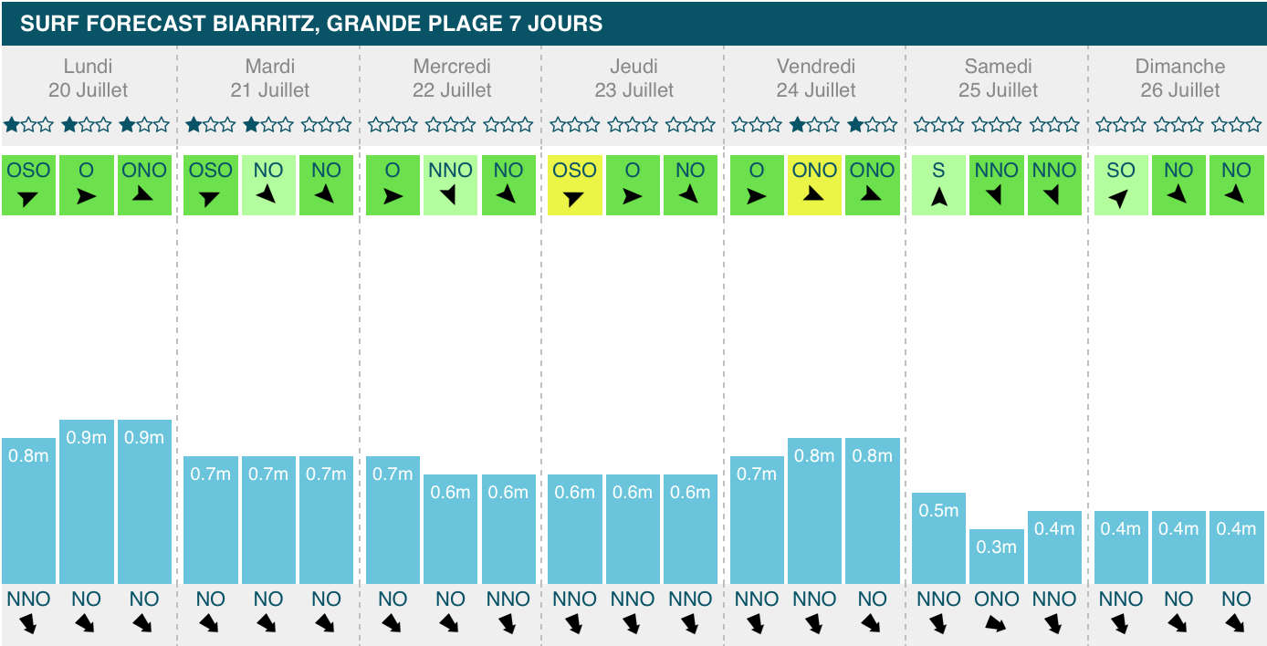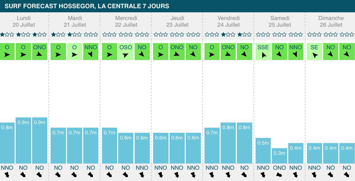 Topo similaire dans les Landes, avec une petite houle courte tout au long de la semaine et peu de fenêtres intéressantes à exploiter. Comme partout sur la façade atlantique, les petites sessions d'été attendront. Ce lundi, au plus fort de la semaine, on attendait 0,8m de houle, 8s de période et des vents d'ouest à 16km/h.