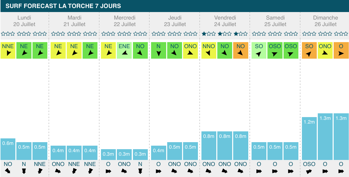 Les prochains jours s'annoncent compliqués du côté de la Bretagne. En ce qui concerne la façade ouest, on notera la présence d'un vent de nord-est en début de semaine, mais une houle quasi inexistante avec 0,4/0,5m, 4s à 5s de période. Il faudra attendre la fin de la semaine pour voir le swell gagner légèrement en consistance. Mais dimanche, au moment où l'on annonce 1,2m et 7s de période, le vent sera de secteur ouest et estimé à 30km/h.