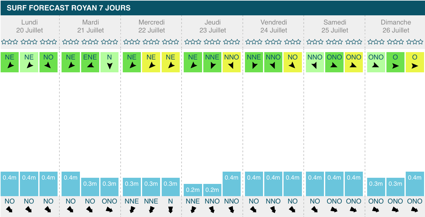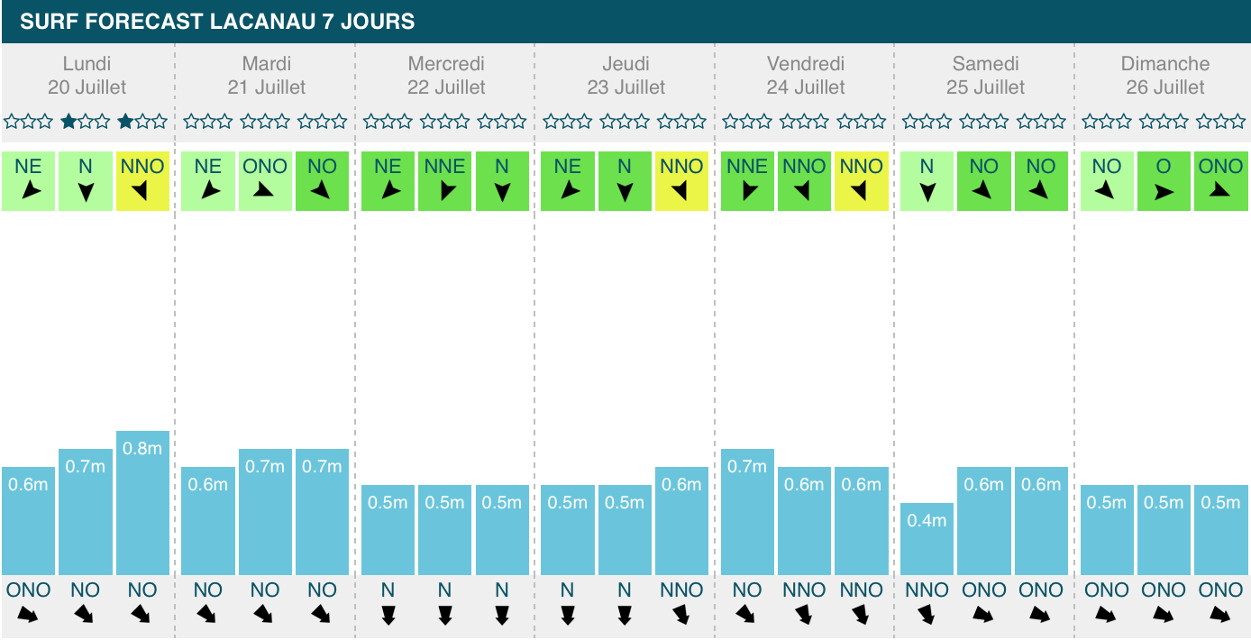 Le swell s'annonce légèrement plus consistant en Gironde, mais un vent défavorable et l'absence de période donneront un tout autre visage aux petites sessions estivales. Le meilleur créneau de la semaine a sans doute déjà eu lieu. C'était ce matin avec une houle de 0,8m, 8s de période et un léger vent de nord-est.