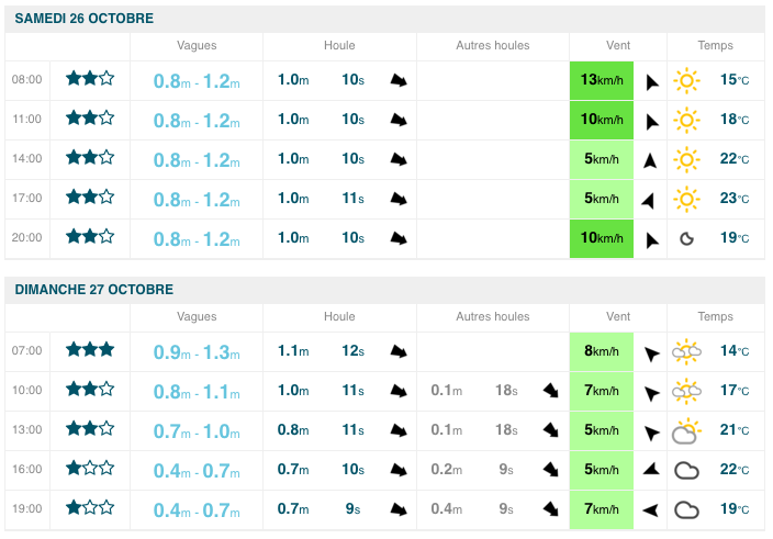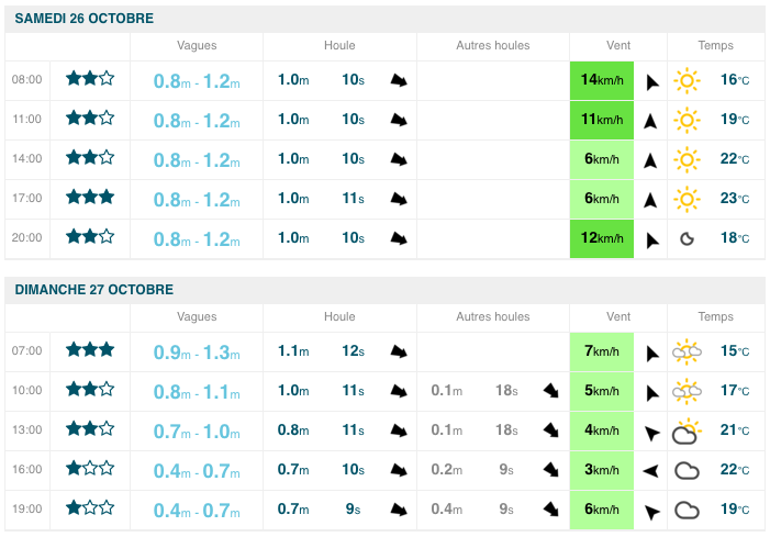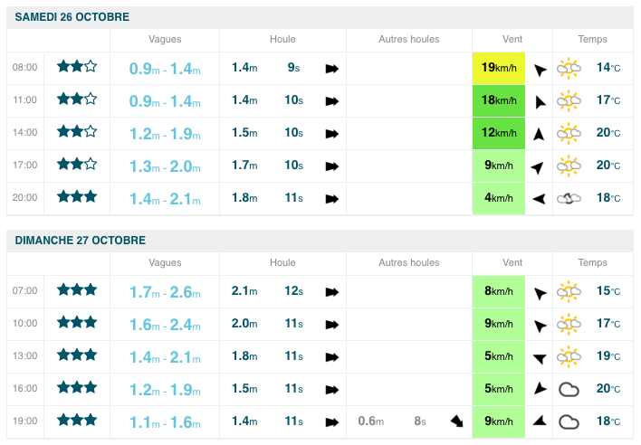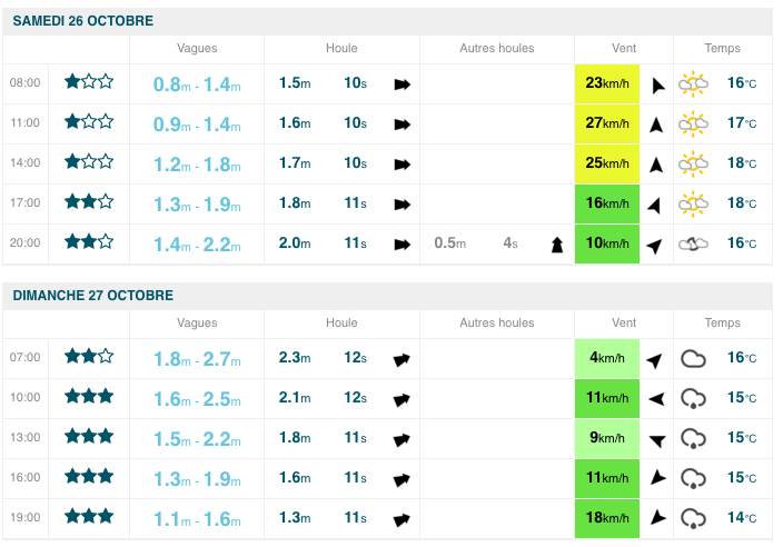 Lacanau, on attend une houle à 1,5m samedi, avec un vent de secteur sud-sud-est decrescendo au fil des heures. Le lendemain, on attend une