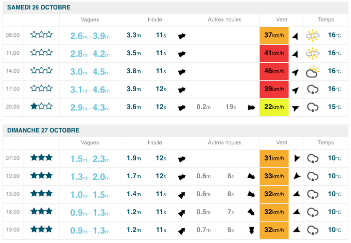 tempête d'offshore à partir de dimanche, ce qui freinera la houle tout au long des côtes bretonnes avec des rafales orientés est à 30km/h à
