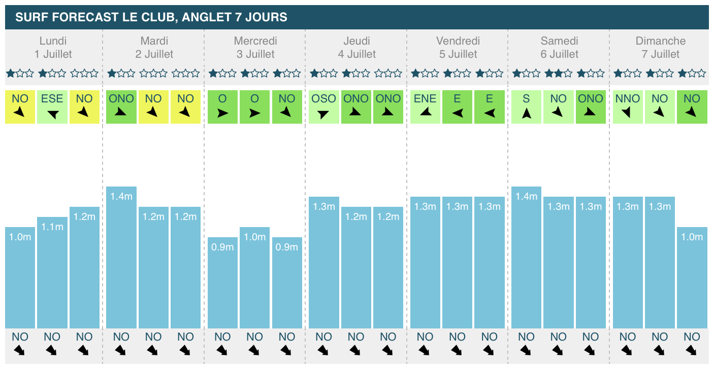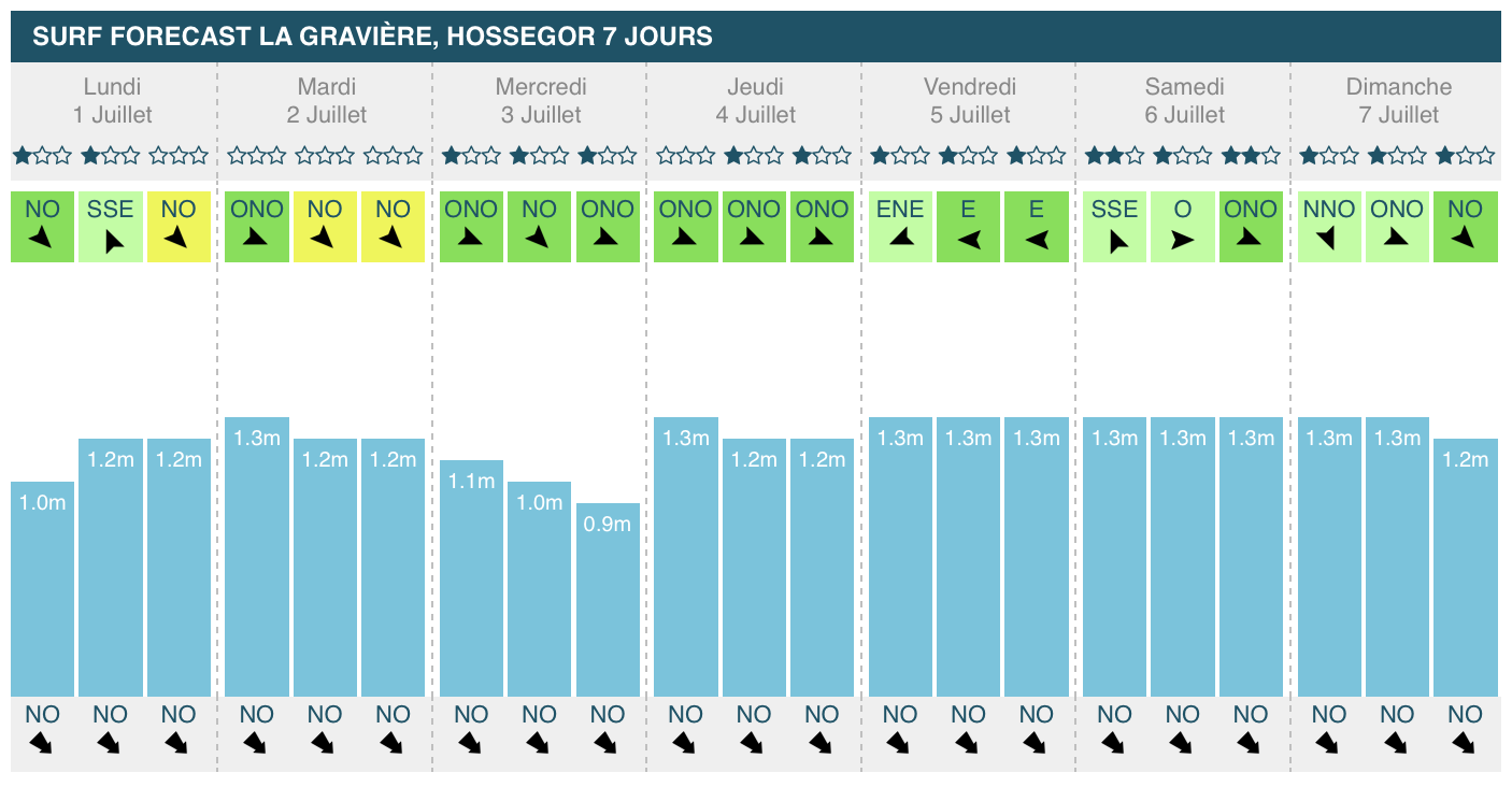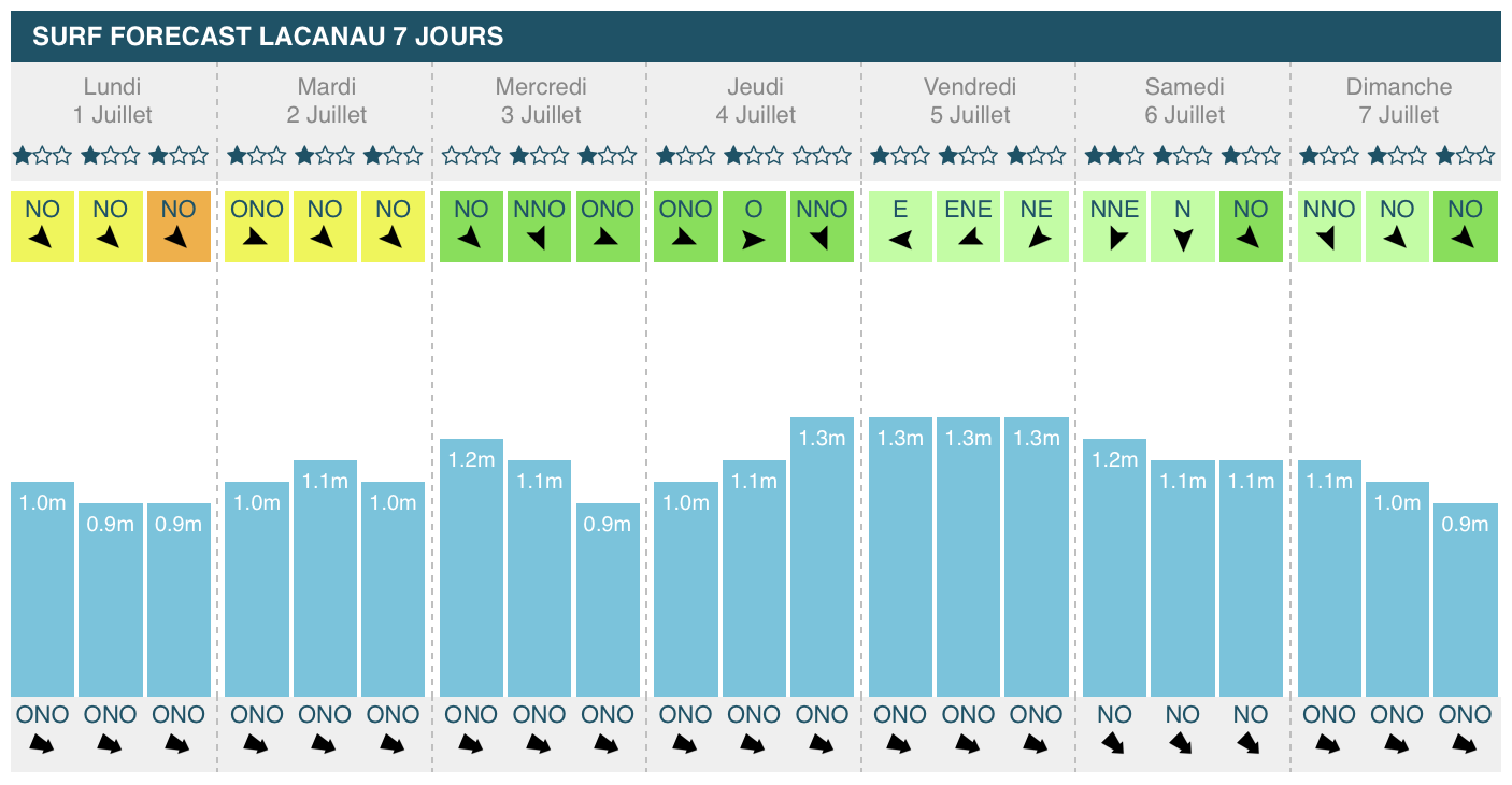 De petites conditions d'été cette semaine dans les Landes ! Si le vent pourra être handicapant jusqu'en milieu de semaine, il devrait faiblir pour révéler quelques lignes à l'eau, bien que peu puissantes faute d'une période forte. Des sessions propres se dessinent vendredi : 1m30, 7s, 8 km/h offshore le matin, 1m30, 9s, offshore à 9km/h le soir. Le vent faible le week-end devrait souligner 1m20 à la série à l'eau mais attention cependant à la période, qui se maintiendra à 9s samedi avant de passer à 7s dimanche : moins de puissance à l'eau et un plan d'eau potentiellement moins propre).