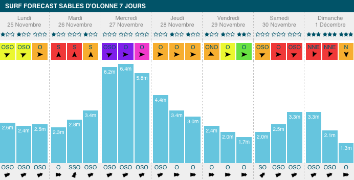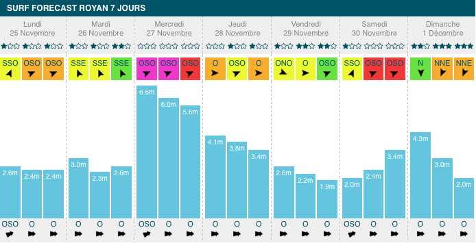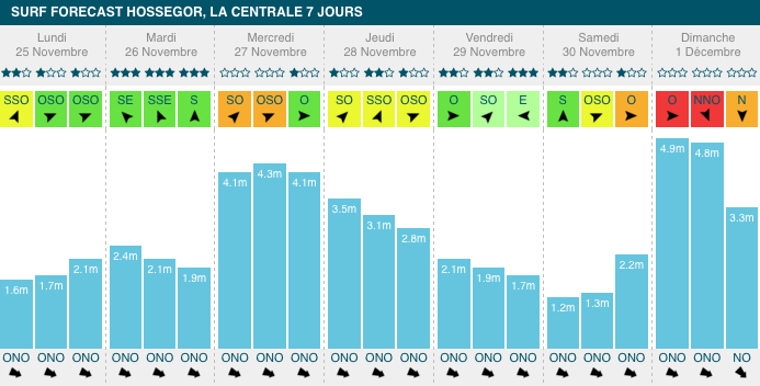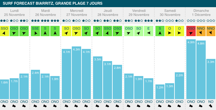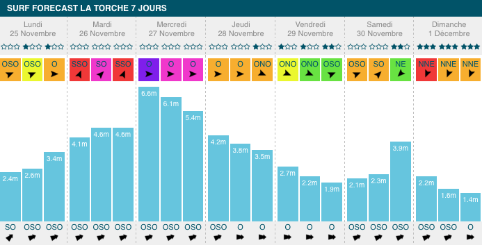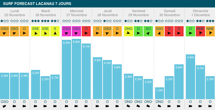 1,3m et 1,9m, période de 10s à 13s, avec de légers vent de sud-sud-ouest. Comme sur l'ensemble du littoral atlantique, les Landes subiront un pic de houle mercredi, mais moins important. Le créneau intéressant aura lieu mardi avec un vent favorable, et vendredi :