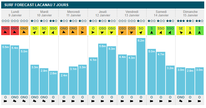 Les Landes sont épargnées cette semaine des vents puissants qui écraseront les plans d'eau dans les départements plus au Nord. En revanche, la houle qui s'annonce sur la côte (plus de 3m la majeure partie du temps) devrait saturer nombre de bancs de sable, ne laissant que peu de place au surf. Pour les chargeurs, une session pourra se tenter mardi en fin de journée (2m à 2m90 à la série, 13s et vent de Sud à 8km/h) puis dimanche (2m10 à 3m20 à la série, 12s, vent de Sud à 14km/h le matin).