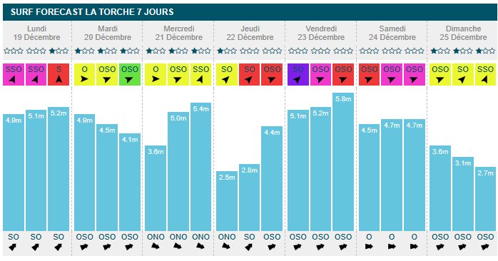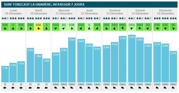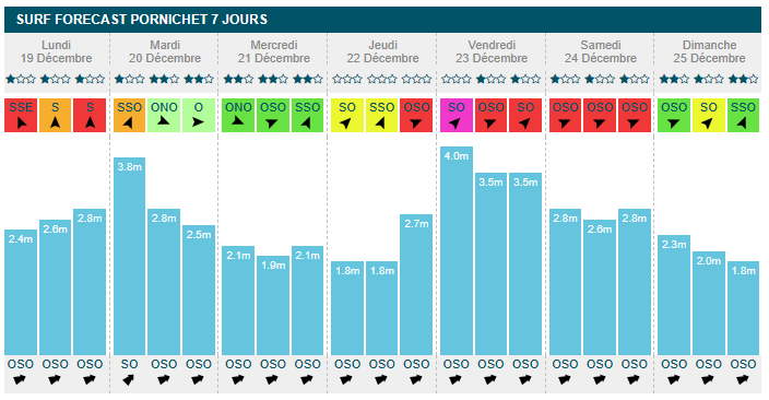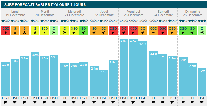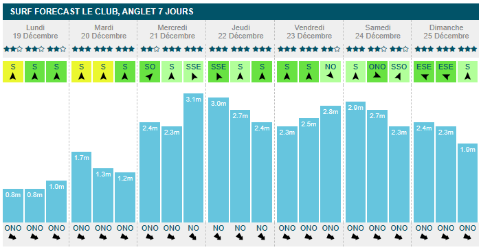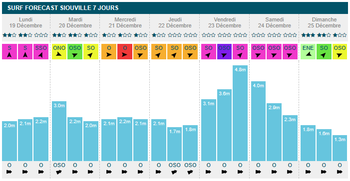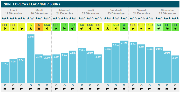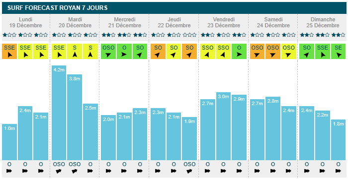 La plus belle journée de la semaine cependant semble s'annoncer dimanche, pour Noël. Le vent devrait se maintenir offshore toute la journée (variant de 10 à 17 km/h) tandis que la houle passera de 2m20 à 1m80 au fil des heures (11 secondes de période). On devrait alors atteindre 2m70 à la série le matin et 2m20 en fin de journée.