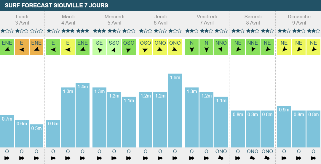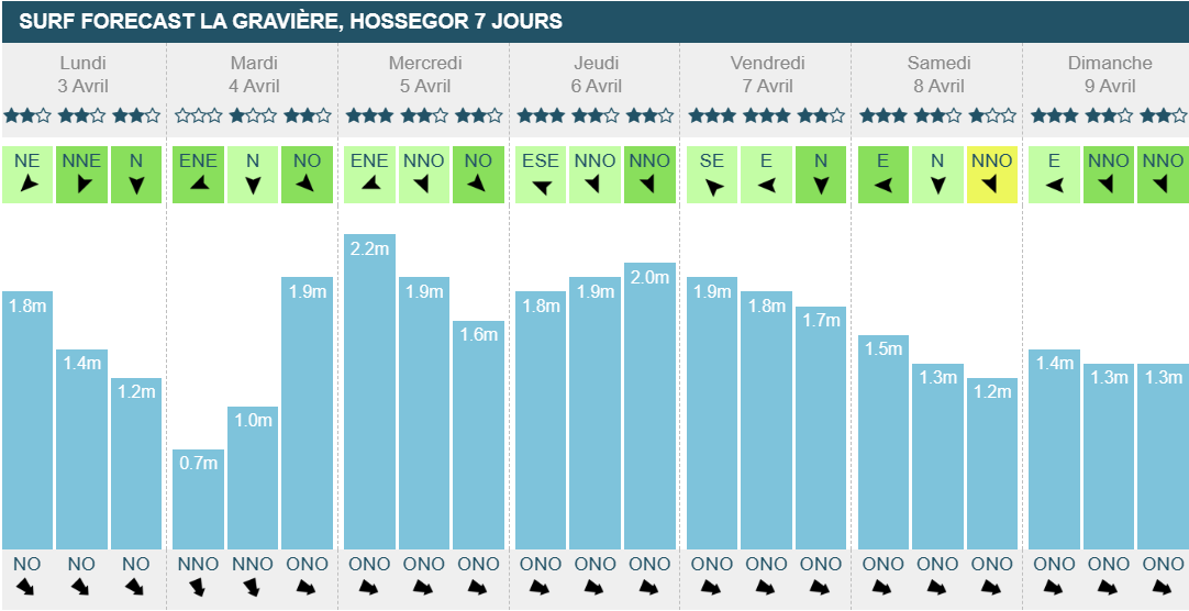 Vous avez sûrement pu surfer sur vos spots de repli ce week-end et cette semaine la plupart de vos spots habituels devraient marcher. Même si le vent sera onshore, la journée de mardi s'annonce bonne. Comme sur tout le reste du littoral, la période grimpe d'un coup dans la nuit du lundi. Mercredi le vent tombera dans la matinée et la houle elle, restera constante. La région ne sera pas épargnée par ce petit coup de vent onshore le jeudi. Le week-end sera plus calme niveau houle et le vent plus fort que le vendredi où il ne dépassera pas 11 km/h en moyenne.