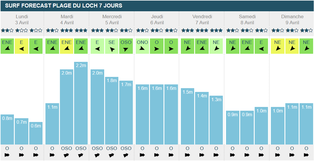 De bonnes vagues sont à prévoir cette semaine sur les plages du Morbihan. La taille semble être parfaite pour que la plage du Loch offre de bonnes vagues, surtout que le vent sera offshore mardi. Si vous avez le choix, optez pour réserver votre mardi et votre vendredi, il n'y aura pas de vent et la période baisse légèrement à 12 - 13, ce qui est plus raisonnable. En revanche les vagues seront bien plus petites ce week-end.
