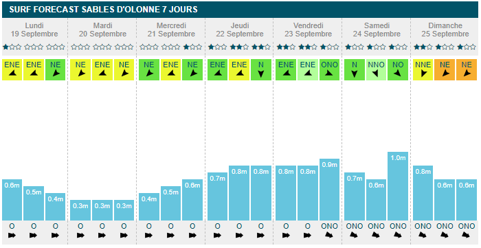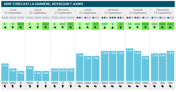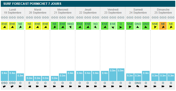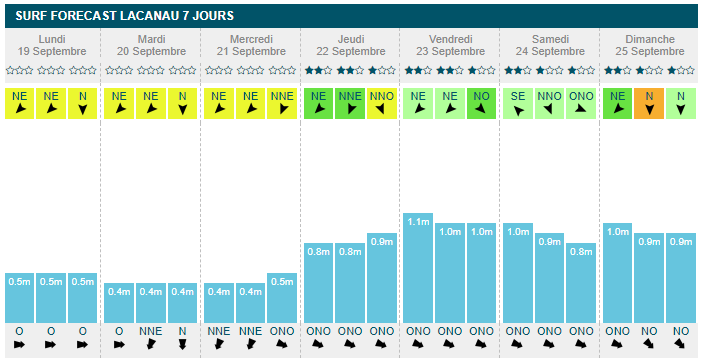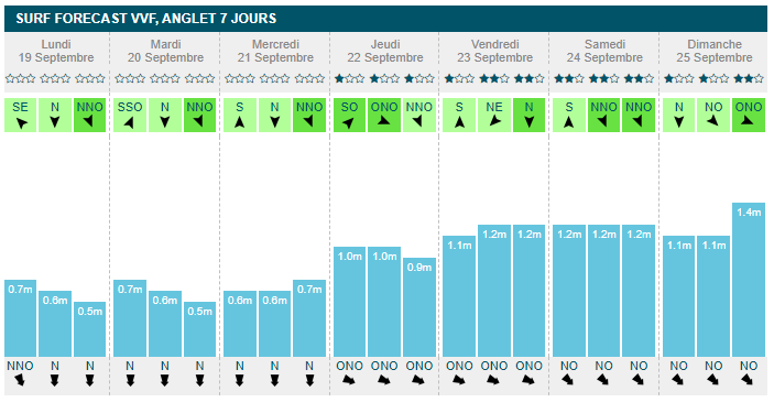 Les plus grosses conditions de la semaine sont attendues samedi en fin d'après-midi (1m, 10s) mais seront accompagnées d'un vent non-favorable de Nord-Ouest à 17 km/h.