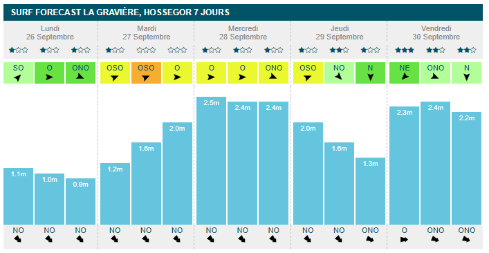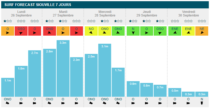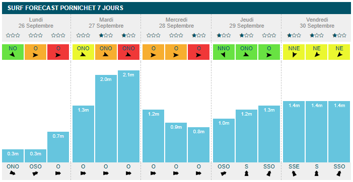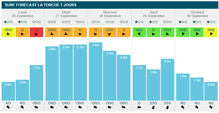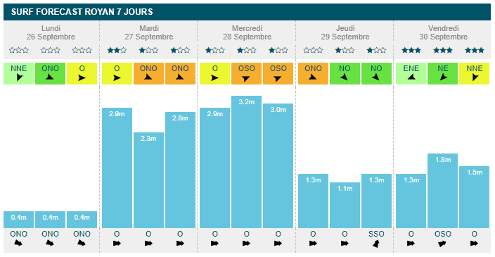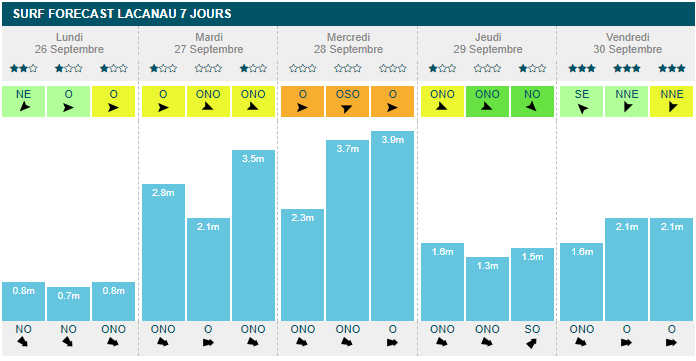 En fin de semaine en revanche, il y aura du surf ! Jeudi en fin de matinée, la chute du vent (5 km/h) découvrira un créneau : 1m60 à la série, issus d'une houle primaire d'ouest de 1m60 (8s de période) et d'une houle secondaire également d'ouest de 90cm (13s de période). La taille se maintiendra ensuite pour atteindre les 2m en fin de journée.