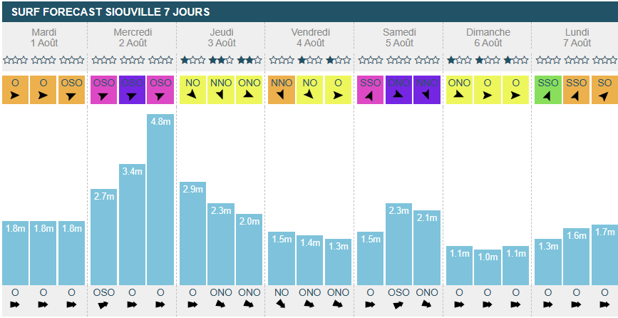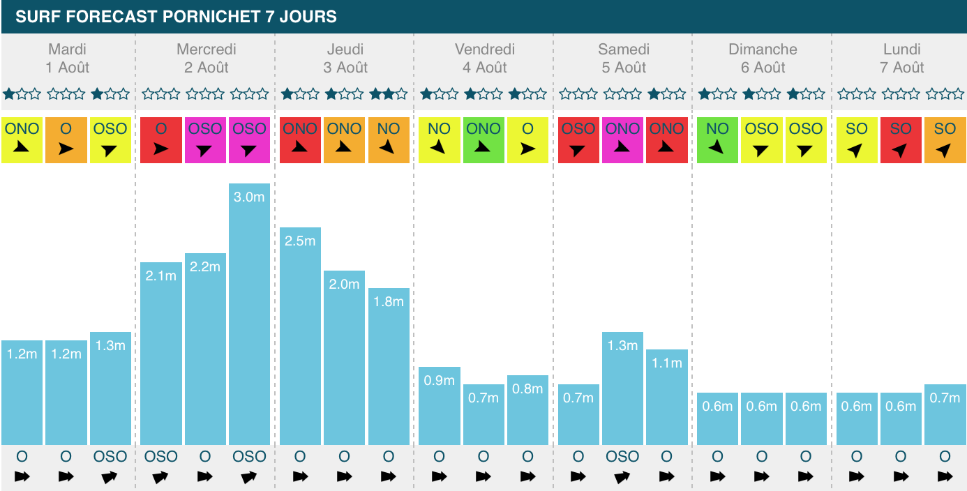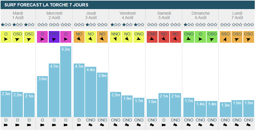 La Torche et ses alentours vont se révéler pendant cette première semaine d'août. Ce mardi les vagues ne sont pas désordonnées, malgré le vent onshore, ce qui est bon signe pour jeudi et vendredi, qui s'annoncent relativement similaire en termes de vent. Mercredi et jeudi seront les deux plus grosses journées de surf. Mercredi, il sera préférable de se rendre directement sur les spots de replis, autrement dit les spots orientés sud ou nord selon votre localisation. Les spots tels que celui de La Torche vont saturer.