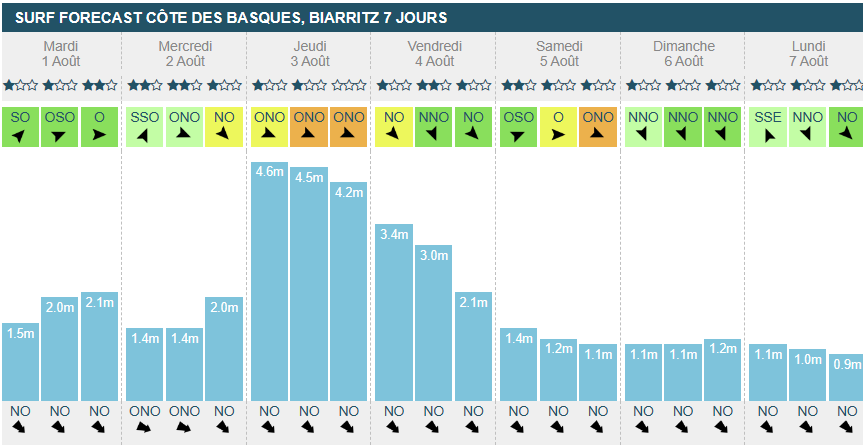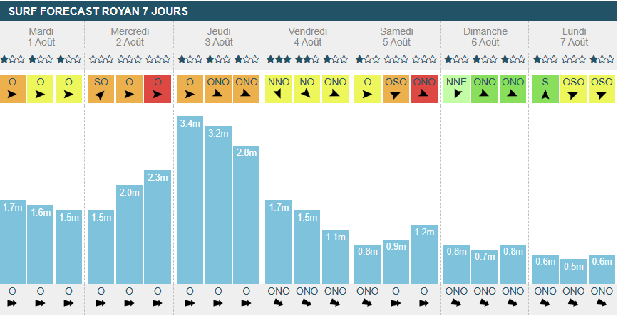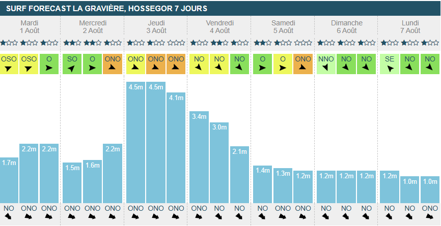 Mardi, mercredi et vendredi seront vos meilleures journées de surf de la semaine. Les vagues ne seront pas grosses, mais plus propres que le jeudi. Jeudi, en revanche pour les plus confirmés d'entre vous, c'est la journée à favoriser.