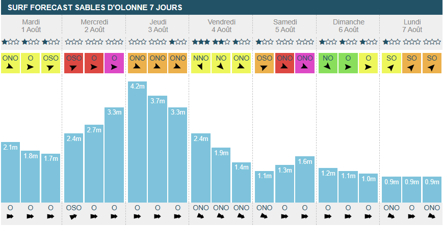 Aux Sables d'Olonne, la plus grosse journée de surf sera jeudi contrairement aux régions plus au nord. Mercredi les vagues seront difficilement surfables, sauf si vous trouvez un spot abrité du vent. Ce mardi ainsi que vendredi seront vos deux meilleures journées, 80 cm dérouleront superbement comme le montre le report du jour.