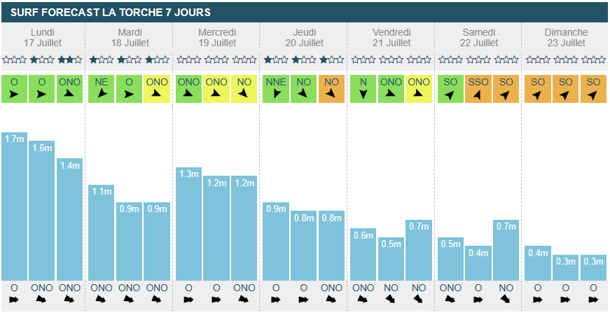 Les meilleures journées que la Côte Basque connaitra en cette troisième semaine de juillet sont lundi et mardi matin. Dès mercredi, la taille de la houle réduira progressivement avant d'être inexistante samedi et dimanche. Jeudi servira également de journée repère, autrement dit, s'il reste encore quelques vagues dans la matinée, il sera sans doute possible de surfer vendredi matin. À suivre...