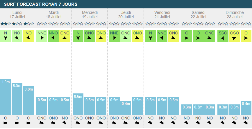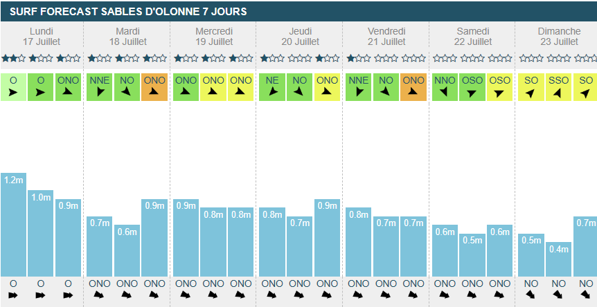 Tout comme c'est le cas en Loire-Atlantique, ce n'est pas une semaine de surf qui se profile sur le littoral vendéen. Il ne reste qu'aujourd'hui, lundi 17 juillet pour espérer trouver des vagues, après quoi la houle s'effondrera pour le reste de la semaine. Le meilleur plan est de s'y rendre le matin midi, avant que le vent ne se lève, la marée sera au plus bas et la houle perdra 0,60m.