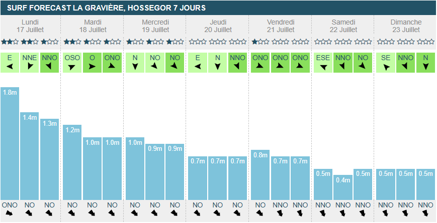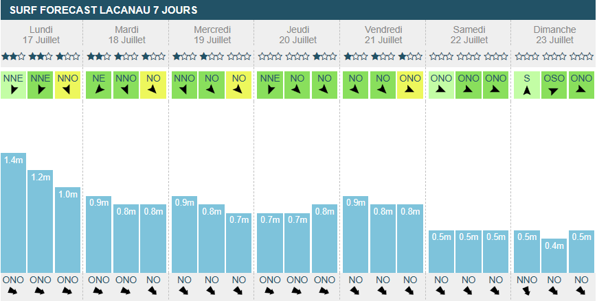 Au moment même où nous rédigeons ces quelques lignes, 1.50m déroulent, sans une ride, sur la majorité des plages Landaises. Une fois alignées, les colonnes bleus qui composent les prévisions forment une courbe décroissante parfaite. Demain mardi, 50cm de moins sont annoncés au petit matin, mais cela suffira largement pour les bancs de sable du 40. Idem pour les journées de mercredi, jeudi et vendredi, où les conditions seront parfaites pour apprendre ou progresser. En revanche il faudra prévoir une autre activité ce week-end et laisser ses planches dans leur rack.