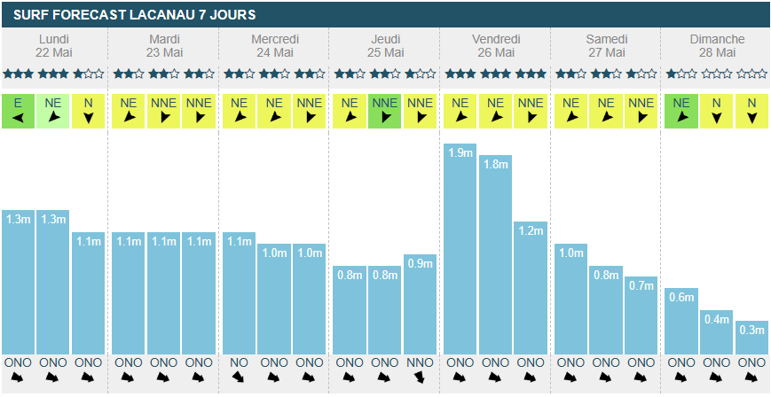 De bonnes conditions sont prévues cette semaine dans les Landes. Actuellement il y a de petites vagues sympathiques sur le descendant, tout le long de la côte. C'est aujourd'hui que le vent souffle le plus fort, en ce début de semaine. Même si le vent sera onshore tous les jours, il n'impactera pas particulièrement vos sessions. Les vagues elles, ne diminueront que très peu en taille. Vendredi petit regain de période et de houle, mais attention ne tardez pas pour vous mettre à l'eau le vent se lèvera en début d'après midi. Samedi matin sera votre meilleure journée. Il restera de la houle de la veille et le vent sera quasi inexistant avant la fin de la journée. Marée haute à 11h12 avec 35 de coefficient, c'est parfait pour vous ! Cela signifie que la marée se calera pour que vous puissiez surfer le matin et l'après-midi à marée basse. Dimanche, ça sera plus petit.