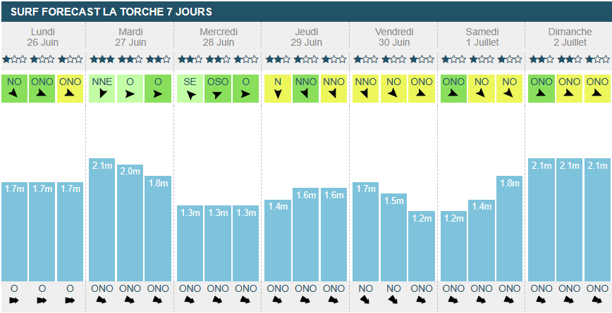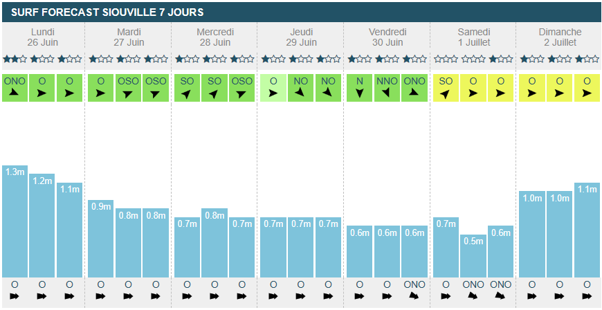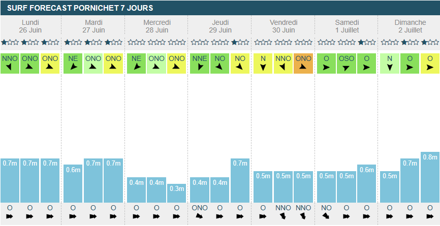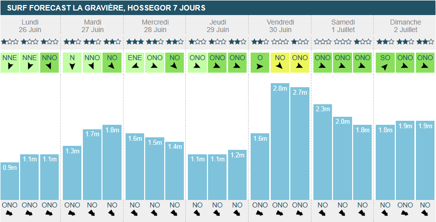 Vous aviez été chanceux la semaine dernière et cela va continuer d'être le cas pour la dernière de juin. Dès aujourd'hui, vous serez en mesure de surfer, même si les deux meilleures journées restent celles de mardi et mercredi. Aucun vent n'est prévu le matin tandis que la houle reste stable, 1m30, 11 secondes de période et ceci tout au long de la journée. Les étoiles s'alignent et les coefficients sont faibles, en d'autres termes ils vous permettront de surfer plus longtemps vos bancs de sable préférés. Jeudi et samedi il y a un coup de vent qui détériorera le plan d'eau. Il sera side le jeudi, ce qui sera quelque peu contraignant pour plusieurs de vos spots habituels. Vous aurez donc tout intérêt à viser les plages qui s'ouvrent face au sud, même si la houle d'ouest ne sera pas suffisamment grosse pour offrir de belles conditions. Vendredi il y a un petit répit le matin avant que le vent ne tourne onshore et ne s'installe toute la journée du samedi puis du dimanche. Mais le weekend restera très correct pour surfer. Cependant, ne vous attendez pas à de grosses vagues.