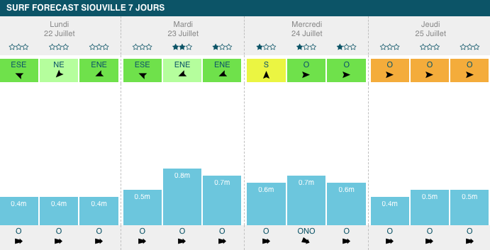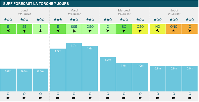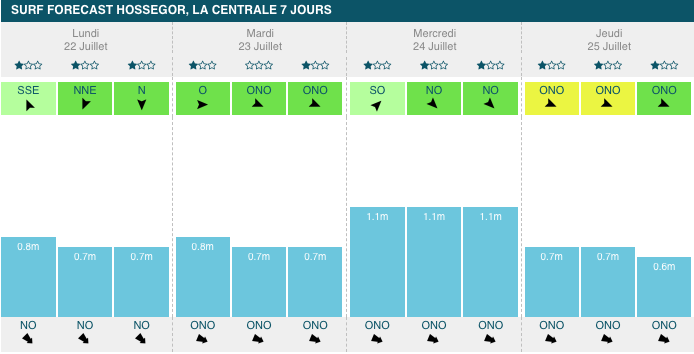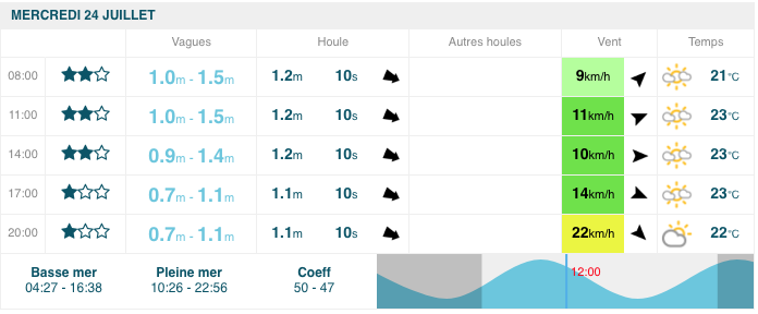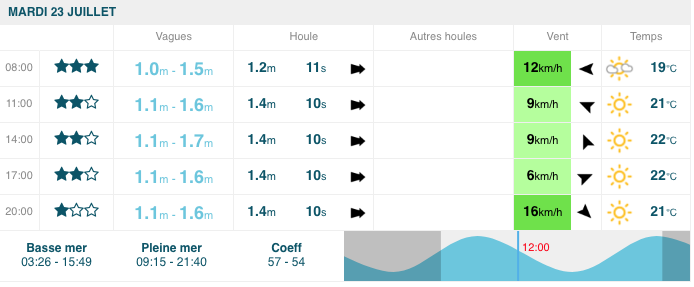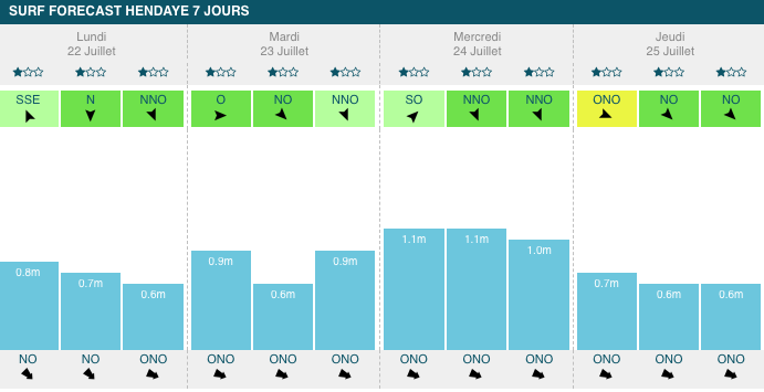 C'est un peu le même topo du côté de Biarritz. Il vous sera possible de continuer de surfer jusqu'à mercredi. Un peu à l'image de ce que nous avons eu ces derniers jours, ce n'est pas bien gros mais cela reste bien mieux que ce que nous a proposé Dame Nature depuis le début de l'été. Mercredi sera clairement la meilleure journée de la semaine ! Tout simplement parce que c'est mercredi que la période sera la plus longue avec 10 à 12 secondes. Le vent sera très faible et les coefficients en baisse.