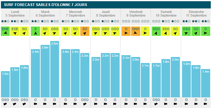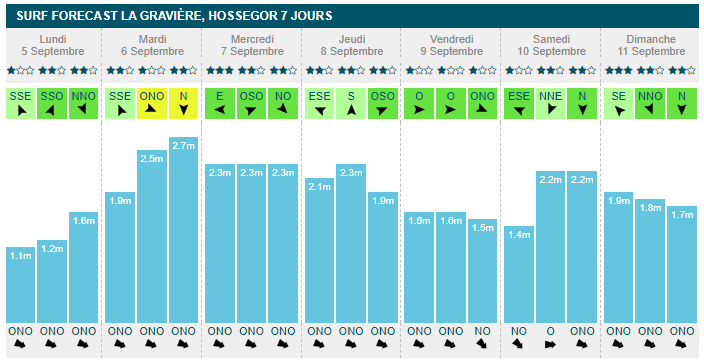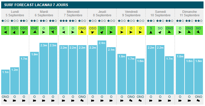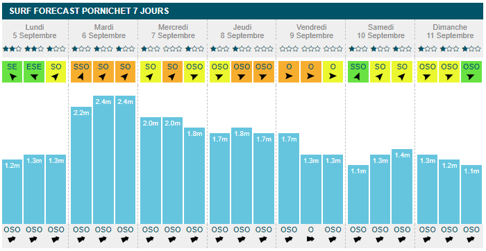 Comme en Bretagne, si la houle est de la partie cette semaine, le vent est là pour gâcher la fête la majeure partie du temps. De lundi à vendredi alors que la houle avoisine les 2m, les vents d'ouest seront proches des 30 km/h. Il faudra attendre le week-end pour voir une accalmie dans l'air.