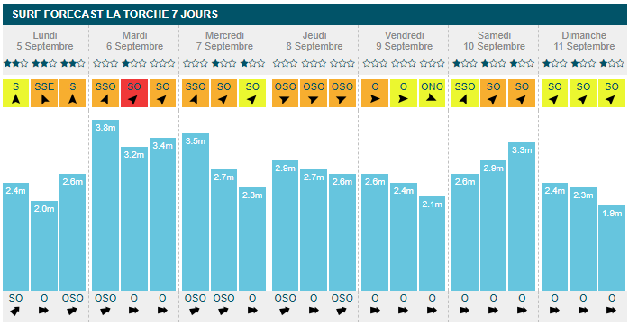 Une baisse de la période vendredi et samedi (8-9s) promet moins de taille à l'eau (1m40 à la série vendredi, 1m20 samedi).