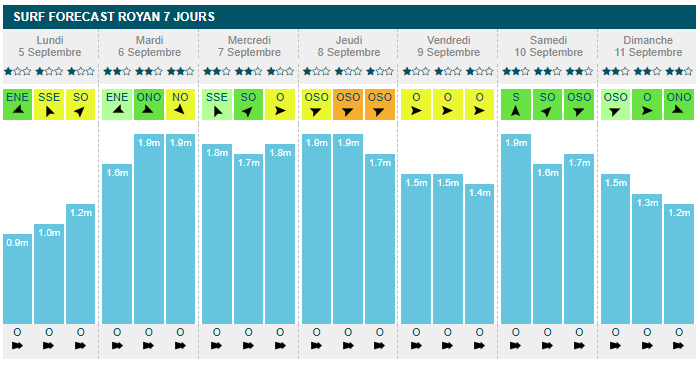 Le week-end, de jolies conditions se dessinent à nouveau, avec de la puissance à l'eau samedi (14s de période) qui promettent de la taille au pic. On attend 2m20 à la série samedi en début d'après-midi. Dimanche, avec une baisse de houle et de période au fil des heures, les conditions seront de plus en plus accessible, jusqu'à atteindre 1m40 à la série (11s de période) en fin de journée.