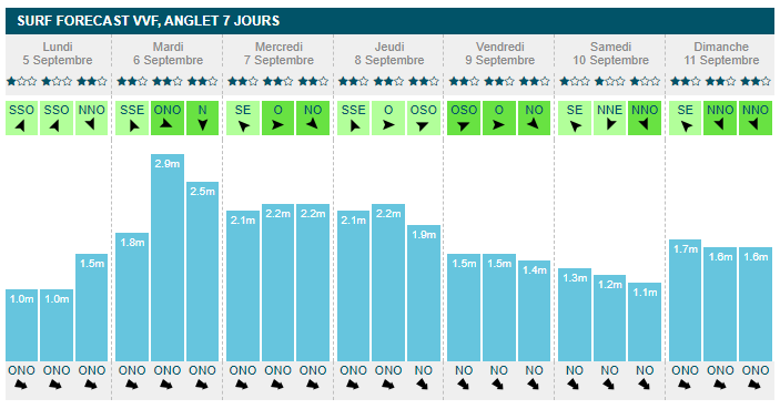 Dimanche, de belles conditions se dessinent à nouveau avec 1m70 à la série, 13s de période et un vent proche de l'offshore à 7 km/h le matin.