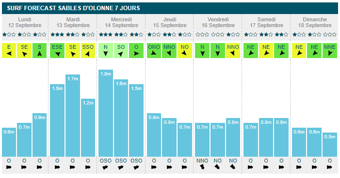 Ça surfe cette semaine en Vendée ! La plus belle session se dessine mardi matin (avant que le vent ne se lève) : 1m50 à la série et 12s de période sous un vent proche de l'offshore à 14 km/h.
